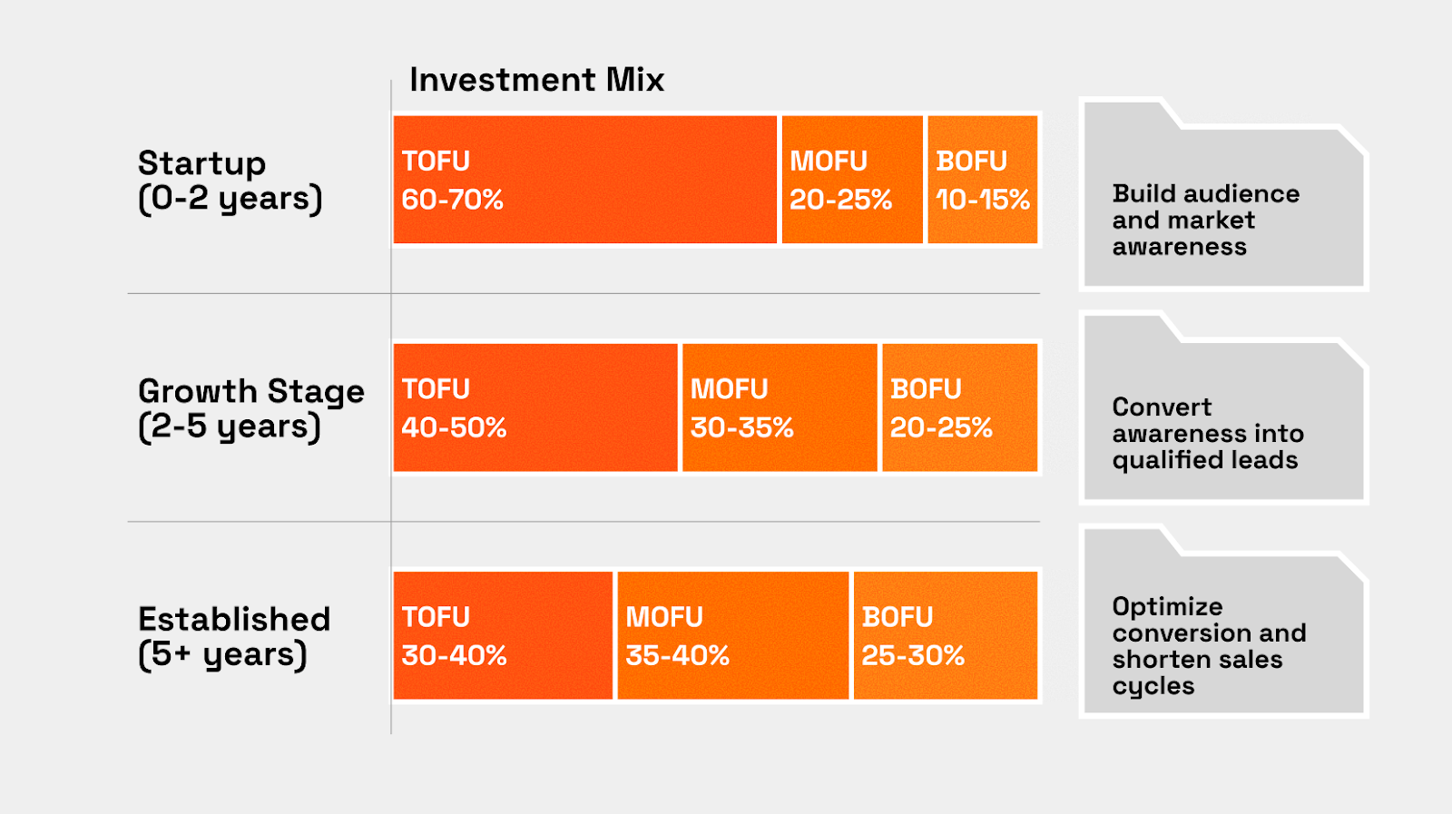 Budget allocation across funnel stages should reflect your business growth goals. Early-stage companies need awareness, so 60-70% of the content budget flows to TOFU. Established brands converting known prospects shift resources toward MOFU and BOFU content that closes deals faster.