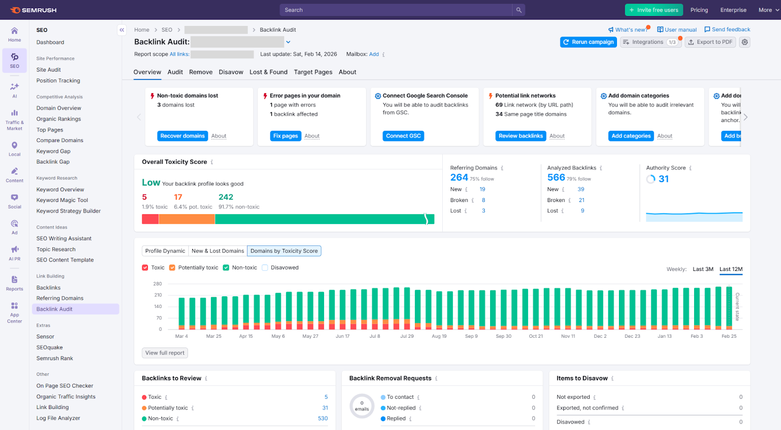 Semrush is a good starting point for most teams because it gives you a detailed backlink profile in one place. To pull your backlink data, go to the Backlink Analytics section, enter your domain, and run the report. You'll see referring domains, anchor text, authority scores, and a breakdown of link attributes like dofollow versus nofollow.