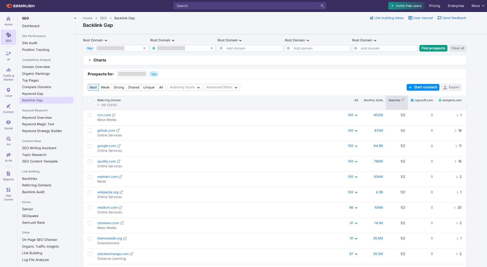 In Semrush, go to the Backlink Gap tool and enter your domain alongside two or three competitors. The tool shows you referring domains that link to your competitors but not to you. These are your best targets because the sites have already shown a willingness to link to similar businesses in your space.