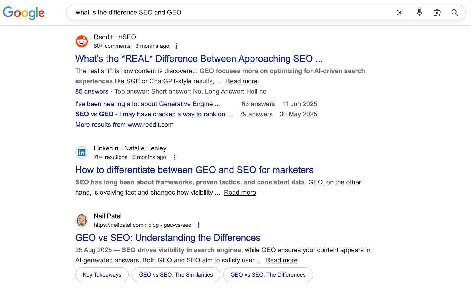 The most visible distinction when comparing GEO vs. SEO centers on what users actually see. SEO produces clickable links displayed in search results: