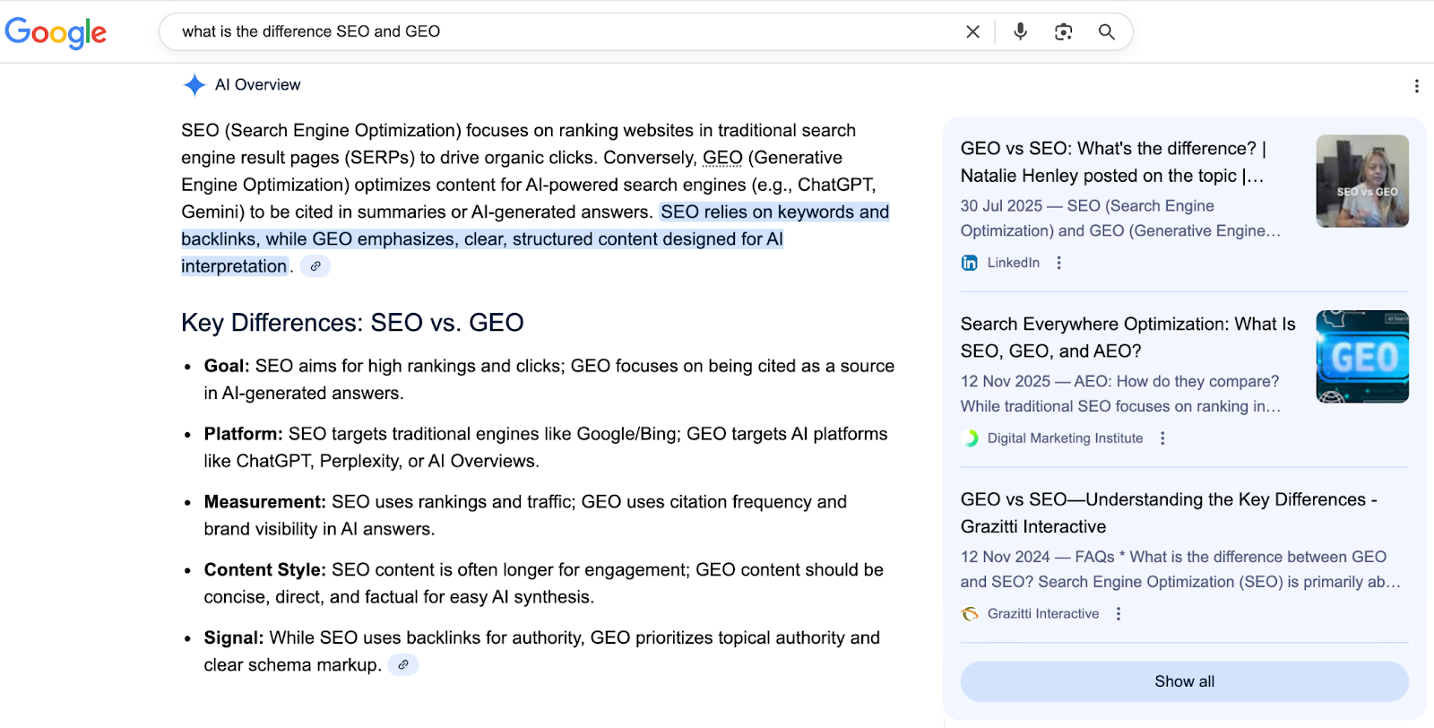 When you compare GEO vs. SEO, the main distinction is where your content appears and how users interact with it. SEO focuses on getting your pages to rank in traditional search results, driving traffic back to your website. GEO, sometimes referred to as LLMO or AEO, optimizes your brand to appear directly within AI-generated responses - meaning your content is cited within answers, even when users don’t always click through to your site.