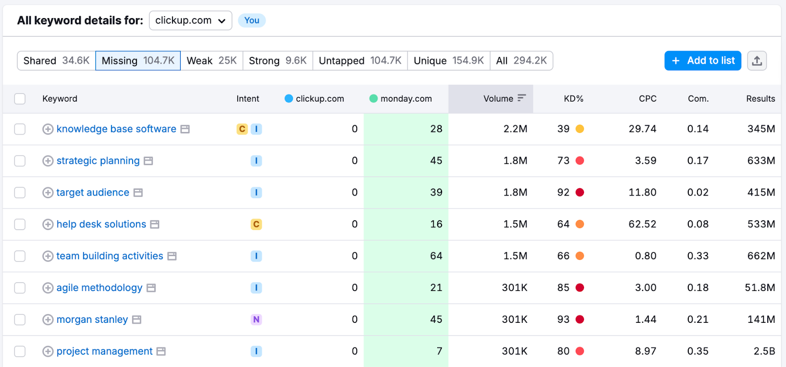 Open up Ahrefs or Semrush and run a content gap analysis between your domain and two or three competitors. This reveals proven keywords that already drive traffic in your space. For example, a comparison between ClickUp and Monday.com shows thousands of “missing" keyword opportunities where one brand has zero visibility while the other is already capturing traffic: